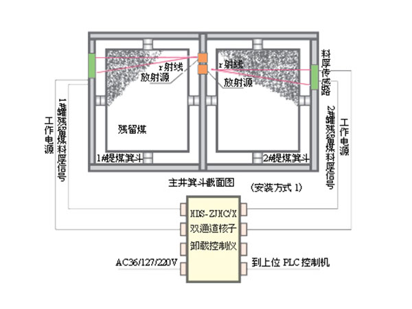 系統結構示意圖 系統設備組成由帶輻射輸出器、屏蔽罐的放射源;射線探測器和固定支架等構成殘留煤厚信號采集部分,由AC127V電源和本安24位單片機等構成控制主機,由本安固態繼電器版、 接線箱等構成料后信號輸出、輸出控制部分。其中放射源經國家環保部門檢測,符《GB4792-84》安全標準,不會對人體產生損傷,請用戶放心!系統工作原理簡述放射源輸出的γ射線穿透機斗鋼板和機斗內卸載后殘留煤,被射線探測器接收,轉換成電信號給控制主機。射線穿透鋼板和殘留煤層時要被部分吸收,被吸收的量與殘留煤層的厚度成一定的對應關系。探測器輸出的電信號強度與殘留煤層的厚度具有一一對應關系。控制儀主機通過檢測電信號的強度按一定的數學模型、公式,就可得出被測截面卸載殘留煤的厚度,并按設置上、下限值進行遠傳報警輸出。實用性及功能實現◇ 該系統可對主井箕斗卸載進行有效安全控制,以免箕斗重載下放或二次裝載的事故發生。◇ 控制主機可檢測箕斗被測載面卸載殘留煤的厚度值,按預設的上、下限報警值進行報警?!?給出上位主機PLC的殘留煤厚度報警值,為經繼電器隔離的干接點信號(常開或常閉)。